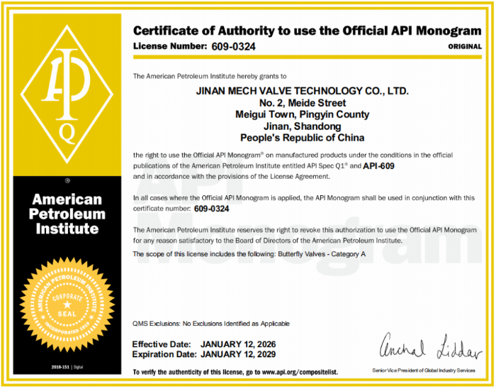 As the most authoritative non-profit organization in the global oil and gas industry, API was founded in 1919. Its standards are adopted in more than 100 countries worldwide and, together with ISO (International Organization for Standardization), play a leading role in shaping international industry norms. API certification is widely regarded as a mandatory threshold for supplier access to global energy enterprises. The successful acquisition of API 6D and API 609 certifications is not only a strong endorsement of Meide Group’s technical strength, but also a new starting point for its global market expansion.