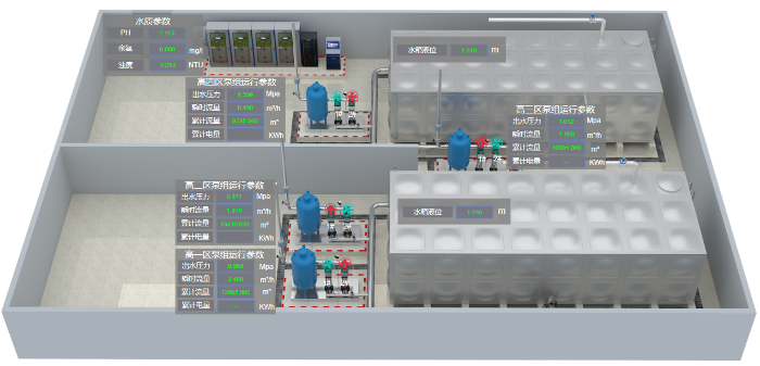 系統(tǒng)對泵房運行態(tài)勢、門禁狀態(tài)和視頻監(jiān)控三維可視化管理,實現(xiàn)泵房全方位管控。通過系統(tǒng)可以全面監(jiān)測泵房各項指標數(shù)據(jù),確保供水系統(tǒng)穩(wěn)定運行。對采集的海量數(shù)據(jù)進行深度處理和分析,實現(xiàn)泵房潛在故障及時預警。系統(tǒng)可以實時對供水數(shù)據(jù)進行監(jiān)控,實現(xiàn)錯峰調(diào)蓄??蓪⒈梅康臍v史數(shù)據(jù)和運行情況進行展示,為管理者決策提供精準的數(shù)據(jù)支持,同時當系統(tǒng)監(jiān)測到泵房異常時,會自動智能識別并發(fā)出警報,使運維人員快速響應,減少事故損失,實現(xiàn)風險快速感知、一站調(diào)度,及時解決問題。