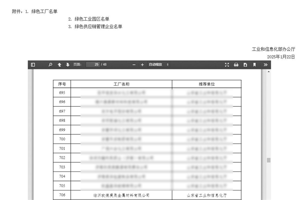 2025年1月23日,中華人民共和國工業(yè)和信息化部正式發(fā)布了《2024年度綠色制造名單通知》,臨沂玫德庚辰金屬材料有限公司(以下簡稱“玫德庚辰”)成功入選國家級(jí)綠色工廠名單。與此同時(shí),臨沂臨港經(jīng)濟(jì)開發(fā)區(qū)也榮耀上榜,成為綠色工業(yè)園區(qū)的一員。這一喜訊標(biāo)志著玫德庚辰在綠色轉(zhuǎn)型道路上邁出了堅(jiān)實(shí)的一步,也為臨沂臨港經(jīng)濟(jì)開發(fā)區(qū)的綠色發(fā)展注入了新的活力。