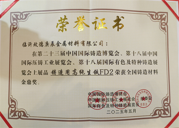 臨沂玫德庚辰金屬材料有限公司的鑄造用高純生鐵FD2榮獲“全國鑄造材料金鼎獎”。