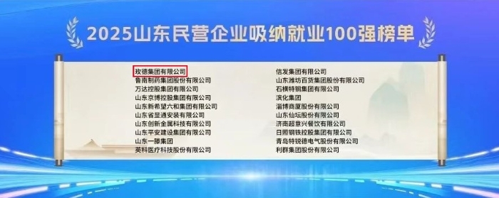 8月19日,2025山東民營企業(yè)百強(qiáng)系列榜單發(fā)布會(huì)盛大舉行,玫德集團(tuán)入選2025山東民營企業(yè)200強(qiáng)、2025山東民營企業(yè)吸納就業(yè)100強(qiáng)。