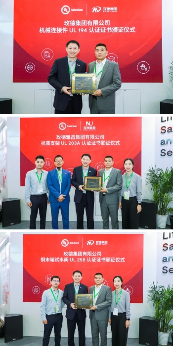 13日上午,在UL展位,UL Solutions全球副總裁、中國大陸及香港地區(qū)總經(jīng)理吳大偉頒發(fā)給玫德集團機械連接件 UL 194 認證證書、抗震支架 UL 203A 認證證書、銅末端試水閥 UL 258 認證證書。