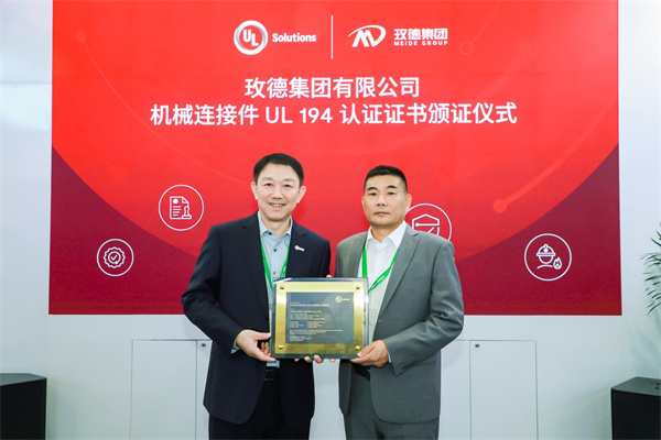 2025年10月13日上午,在第二十一屆中國(guó)國(guó)際消防設(shè)備技術(shù)交流展覽會(huì)UL展區(qū),一場(chǎng)隆重的認(rèn)證證書(shū)頒證儀式吸引了眾多參展商和專(zhuān)業(yè)觀眾的目光。玫德集團(tuán)在此榮獲UL Solutions頒發(fā)的三項(xiàng)重要產(chǎn)品認(rèn)證證書(shū),包括機(jī)械連接件UL 194認(rèn)證、抗震支架UL 203A認(rèn)證以及銅末端試水閥UL 258認(rèn)證。UL Solutions全球副總裁、中國(guó)大陸及香港地區(qū)總經(jīng)理吳大偉親臨現(xiàn)場(chǎng)頒發(fā)證書(shū),玫德集團(tuán)山東邁科智能科技有限公司高級(jí)副總裁李英兵代表集團(tuán)出席認(rèn)證證書(shū)頒證儀式,這一重要時(shí)刻見(jiàn)證了玫德消防產(chǎn)品在國(guó)際化征程上的新突破。