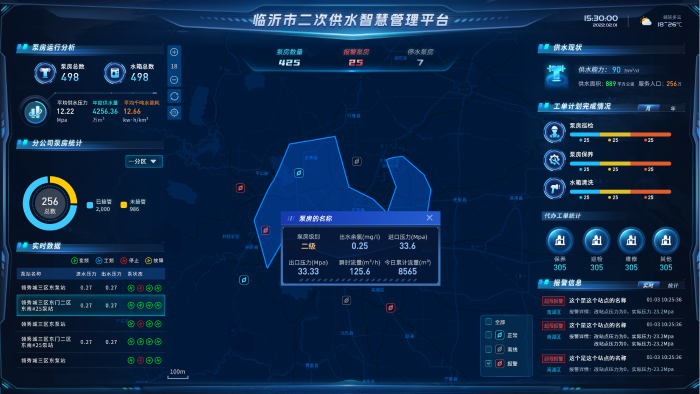 平臺看板集中展示水廠與泵房位置及運行狀態(tài),實時監(jiān)控壓力、流量、水質(zhì)等20余項指標(biāo),支持按區(qū)域、時間、設(shè)備類型多維度查詢,各運行參數(shù)一目了然,直觀顯示設(shè)備異常位置與狀態(tài),及時發(fā)現(xiàn)問題并解決。
