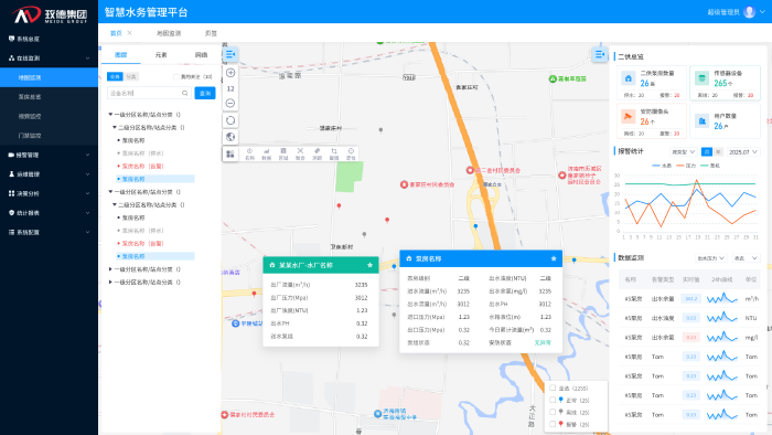 平臺通過歷史數(shù)據(jù)分析建立預(yù)測模型,實現(xiàn)設(shè)備異常、水質(zhì)波動的分級預(yù)警,并支持一鍵生成多維度運行分析報告??稍谠O(shè)備完全失效前識別潛在故障,使維護(hù)人員能夠提前介入處理,避免突發(fā)停機(jī)導(dǎo)致的供水中斷,降低應(yīng)急維修成本。