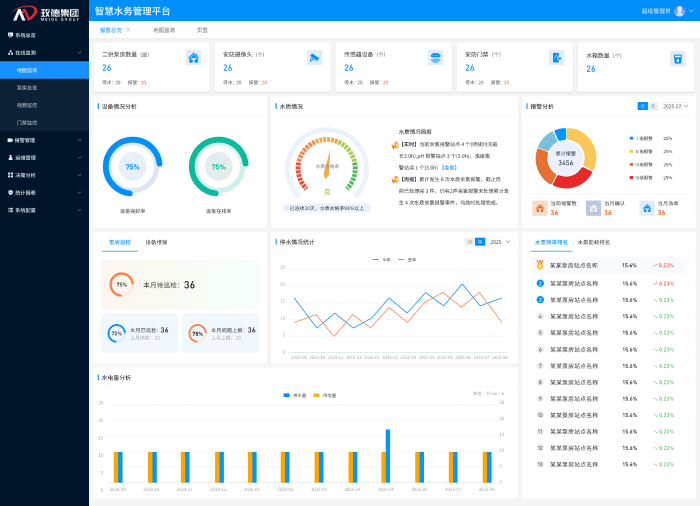 智慧水務(wù)平臺以數(shù)據(jù)集成與分析為核心,構(gòu)建了一套覆蓋供水系統(tǒng)全流程的數(shù)字化運營體系。該體系通過實時監(jiān)測、智能預(yù)警與閉環(huán)管理等功能,有效提升水務(wù)運營的透明度、效率與安全性,為管理人員提供全面的決策支持。平臺主要功能包括以下方面: